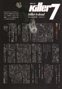 - killer7 killer is dead has not been published in English, although it has been translated into English by two separate groups. First, devil have mercy translated the story chapters in 2021, and later in 2023, PT used the script as the foundation for a new translation, with Nyarlathotep ensuring the translation lined up with Shigeki Birkin‘s characterization in TRAVIS STRIKES AGAIN: NO MORE HEROES. The Special Interview was also translated by Row, NewWorldOrder, and PT.
